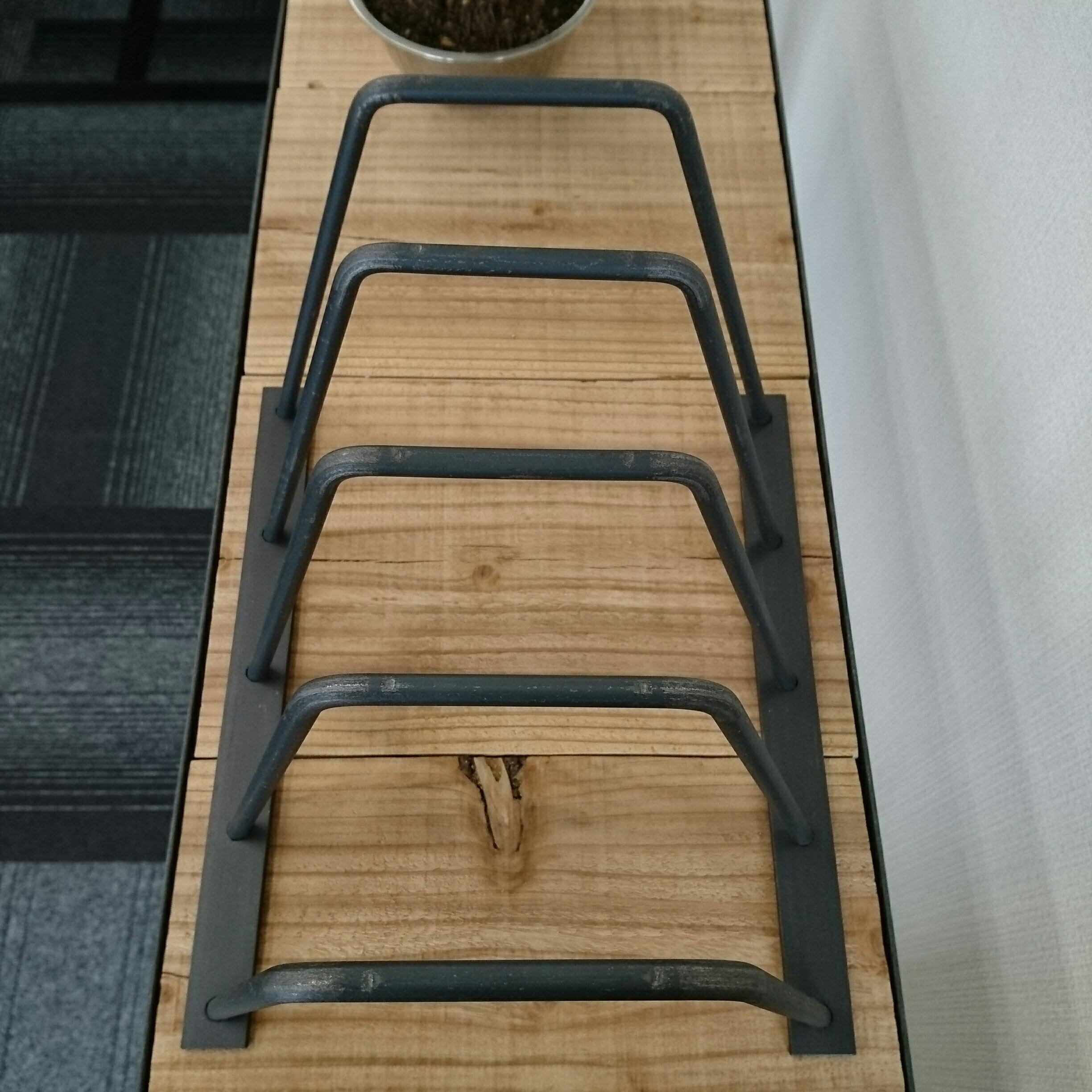 かさばる、見栄えが悪い、などの雑誌特有の収納をアイアンでリアルに表現した、シンプルスマートな1品です。アイアン丸棒を丸く曲げて角度を少し付けた本立てです。