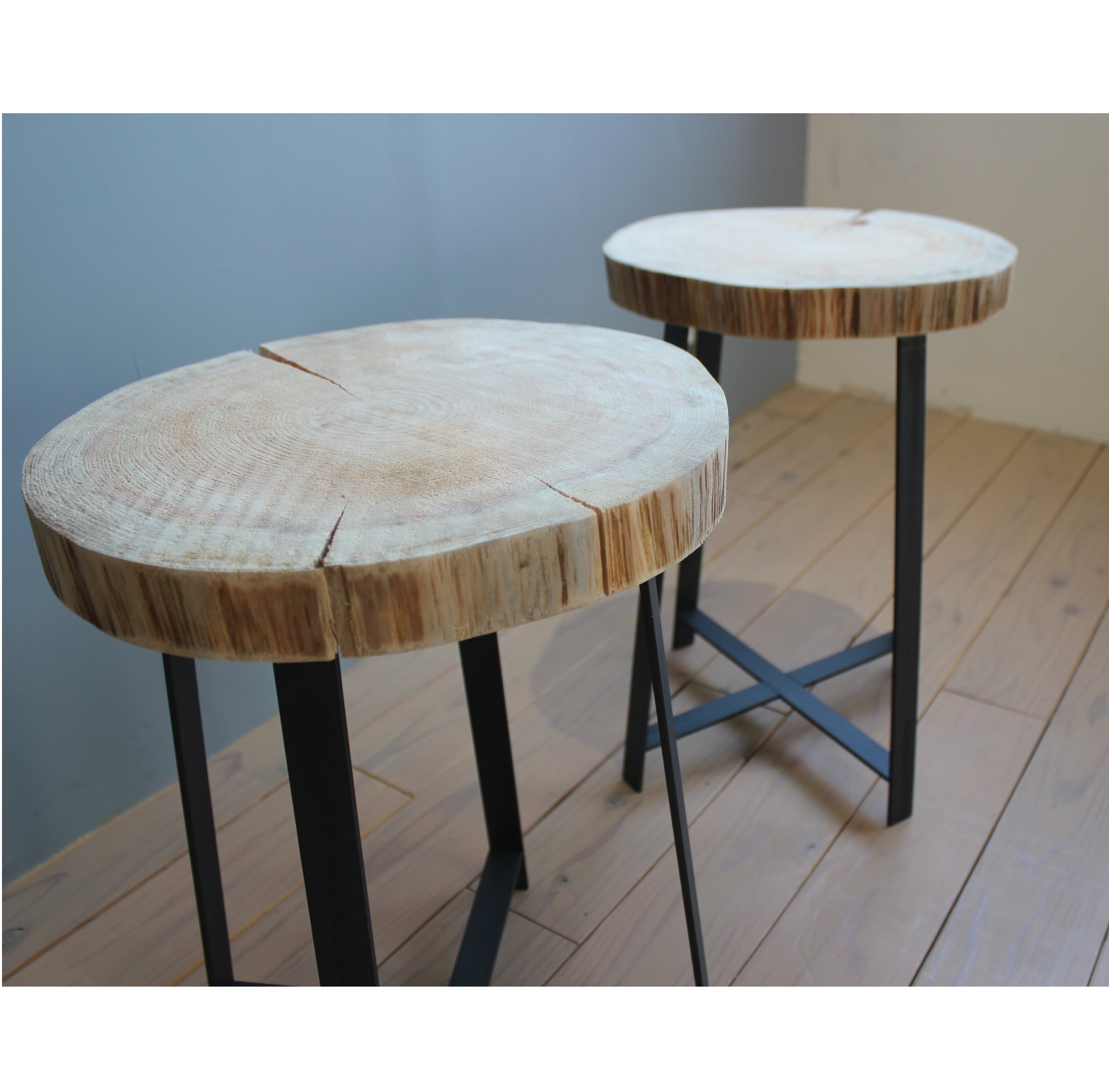 スリムで可愛いOLD感も兼ね備えた切り株スツールです。35mm厚さの切り株の座面で重厚感を出し、ハの字に広がるアイアンで上品さと安定感を持ちバランスよく構成しました。